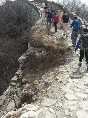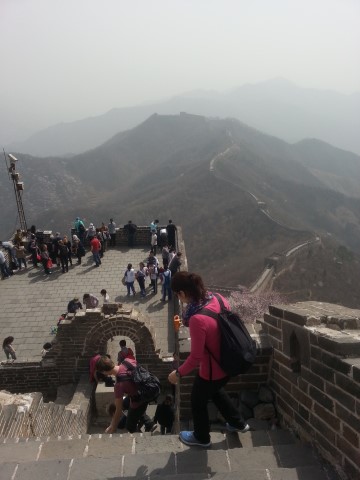 The Great Wall of China is about 9000km long, which is a bit too much of a trek even for Dan. You can go to different sections so we (Dan) opted for a slightly more obscure one where a guide takes you on a hike up a mountain to an old, unrestored and downright dangerous part, and then you walk it back down to the restored touristy area. Fitness February did not serve me well and my legs hurt for days afterwards. But in spite of my wheezing and complaining as we climbed the mountain, it was absolutely the right thing to do. We got to the top feeling immensely pleased with ourselves and went up a little ladder into the first tower. There were stones giving way, no railings, cavernous gaps everywhere. A rather stunning view though. Better still, the view wasn't hindered by swarms of tourists because most people go to a different, less treacherous part.