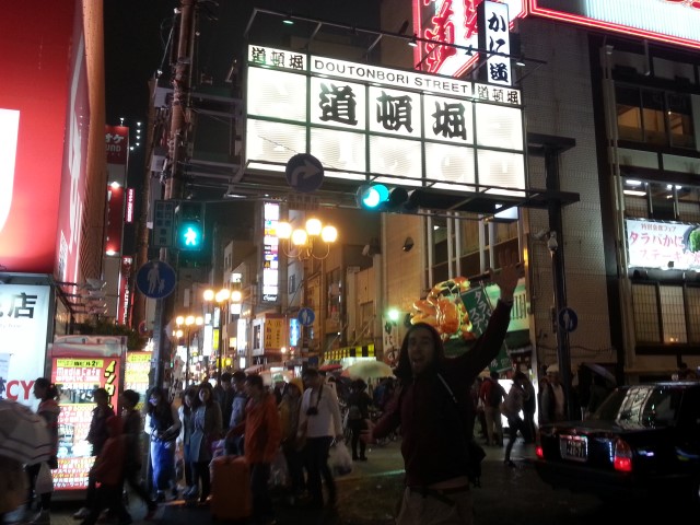 We heard tell of a lively street called Dotonbori, a must-see at night, so after dinner (I had a salad in TGI Fridays, a sad day) we went to try and find it. So many times on this trip we've looked something up and assumed it will be obvious when we get there. Roughly an hour we meandered through nearby streets, assuming we had covered every possible area. We were about to give up when I saw in the distance, a large bowling pin rooftop. It seemed like a good bet and it was. The street would be especially delightful for those interesting in Japanese cuisine, as it has lots of street food vendors, but it's still colourful and cheerful with lots to look at, without being superficial and glitzy. The Running Man is there. I don't know what it is, or what it signifies, but we got a picture with it just in case.
