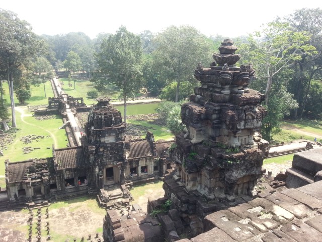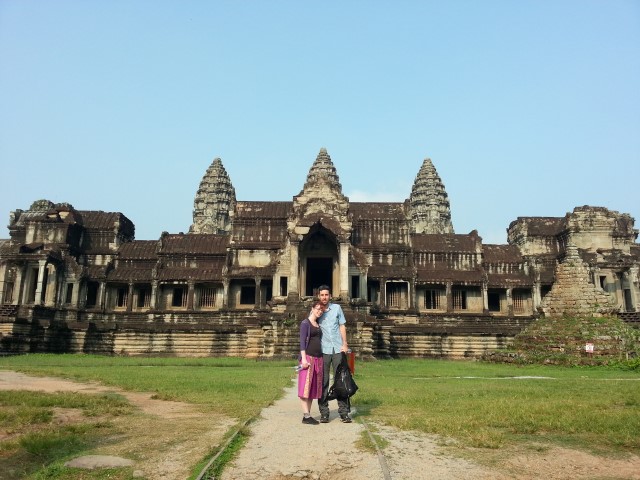 Angkor Wat is a large formerly Hindu and presently Buddhist temple just outside Siem Reap. Throughout history its religious affiliation has changed depending on who's in power. We hired a tour guide. When you're limited in time it's much easier, and things cost nothing in Cambodia. He turned out to be a former Buddhist monk and spent much of the tour trying to convert us to Buddhism. We read to cover shoulders and knees as always, men included this time, and when we met him asked was our attire suitable. He looked sadly at my t-shirt and said the sleeves might be a bit short. I specifically read that a t-shirt was fine coverage so I think he hated shoulders more than most.