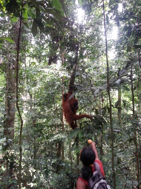 Andre brought us into the jungle the next day to see some orang-utans. Several other tour groups joined us in a clearing, where two mother and baby orangutan groups were congregating. We watched them swinging around, the girls awwing at the adorable babies, and took a lot of blurry, meaningless photos. Andre took Dan aside and told him that because we weren't on a schedule, we were going to engage in battle of wills with the other groups. With less people around, he said, the orang-utans were likely to come right down to the ground, and eat the fruit he had brought. And so the battle commenced. We won, because Andre is the greatest. And he was absolutely right. The two mothers were semi-wild, meaning they were kept in the reserve centre, and sent back out when deemed capable. The babies then were fully wild as they had been born in the jungle. The two mothers took food straight from his hand. We couldn't go too near as the mothers can be a little tetchy and you don't really want to end up in a row with one.