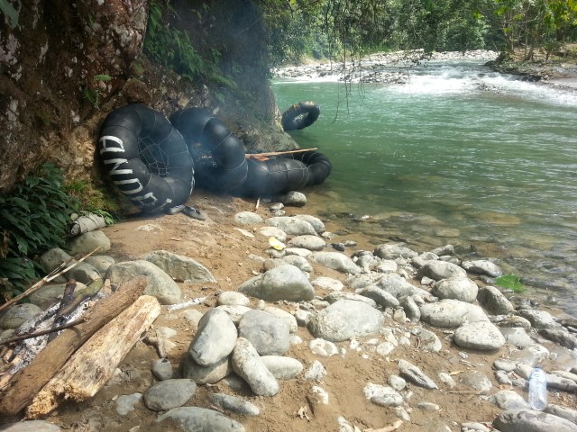 It was a day for facing fears, because our next task was to tube (white water raft) back down the river to the village. I reminded Andre that I couldn't swim, but he reassured me that it was perfectly safe. The raft was four large inner tubes roped together. For safety, you hang on to the person in front of you. They have a somewhat more relaxed attitude in Bukit Lawang. It was awfully good fun though, I have to admit.